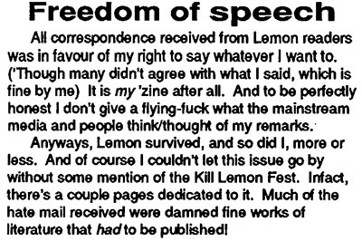 It was not all one sided: there were letters of support from fanzine writers, and editors of underground music papers. Underworld editor David Higgins, himself a former “Lemon” writer who would go on to captain the flagship websites of both Fairfax and News Limited a decade later, wrote: