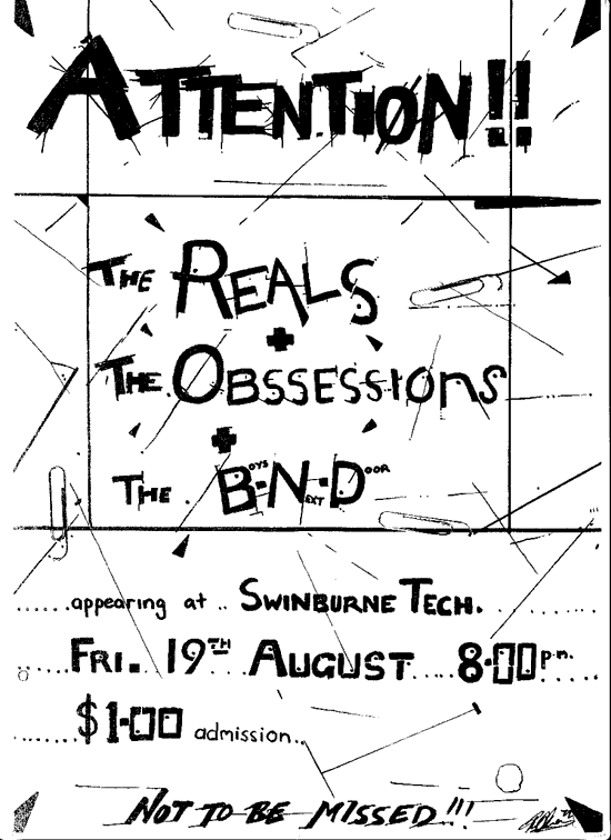 A pre-Suicide night at Swinburne Tech, featuring Gray & Walsh's pre-Negatives outfit the Reals and the Boys Next Door - the source of a widely bootlegged BND tape.