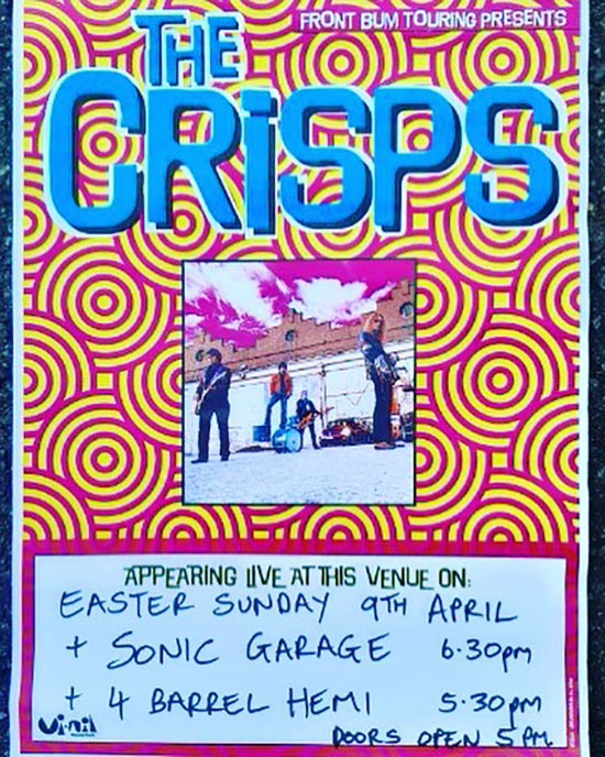 Gigs by The Crisps gigs are rarer then hen’s teeth, or a Clive Palmer T shirt at a Greens rally. They have released a blistering, six-track mini album that shakes the foundations of melody, with blistering guitars and the best drum sound I have heard make it to tape in years These tracks were recoded around 20 years ago and have been put out by Mark Fraser via the home of pub and garage rock, Vil Nil Records. The EP is full of garage rock gems and brilliant, melodic arrangements.The band has reformed briefly for a tour to mark the record’s release.