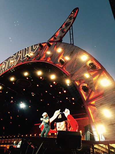 “Let There Be Rock” had what seemed like a 20-minute guitar solo from Angus. He walked, still playing, from one end of the stage to the other, every corner he could reach. I was especially moved to see him on the walkway, surrounded by a sea of people, everyone of them loving him, playing his heart out. It was so moving, I think partly because he occupies the role of a little boy, and he is so so pale, so fragile, that seeing someone so exposed just … well, I had to wipe aside a few tears. That was the best part of the show. Angus was even playing the guitar with his tie.